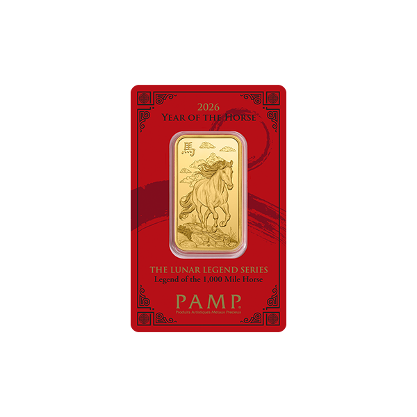 The Lunar Legends series tells the stories related to each of the 12 animals of the Chinese Zodiac. 2026 is the Year of the Horse – the 1,000 Mile Horse is a mythical creature of classic Chinese folklore, able to travel one thousand li, or approximately one third of a mile, in a single day. This amazing horse was too swift to be mounted by anyone but Bo Le, a famed expert. The 1,000 Mile Horse is captured in 1oz of pure gold! A symbol of perseverance and mythical might, it’s a striking addition to any collector’s stable. Housed in a vibrant CertiPAMP assay card accompanied by a gift sleeve, each bar is individually serialized. Third issues in the Lunar Legends series.