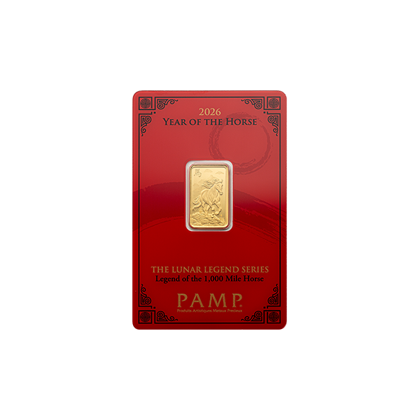 The Lunar Legends series tells the stories related to each of the 12 animals of the Chinese Zodiac. 2026 is the Year of the Horse – the 1,000 Mile Horse is a mythical creature of classic Chinese folklore, able to travel one thousand li, or approximately one third of a mile, in a single day. This amazing horse was too swift to be mounted by anyone but Bo Le, a famed expert. The 1,000 Mile Horse is captured in 5g of pure gold! A symbol of perseverance and mythical might, it’s a striking addition to any collector’s stable. Housed in a vibrant CertiPAMP assay card accompanied by a gift sleeve, each bar is individually serialized. Third issues in the Lunar Legends series.